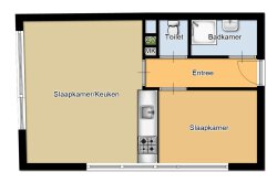 Indeling: entree/ hal, toilet, keuken v.v. kookplaat, afzuigkap, magnetron en koelkast, ruime woonkamer, 1 slaapkamer, badkamer v.v. douche en wastafel.