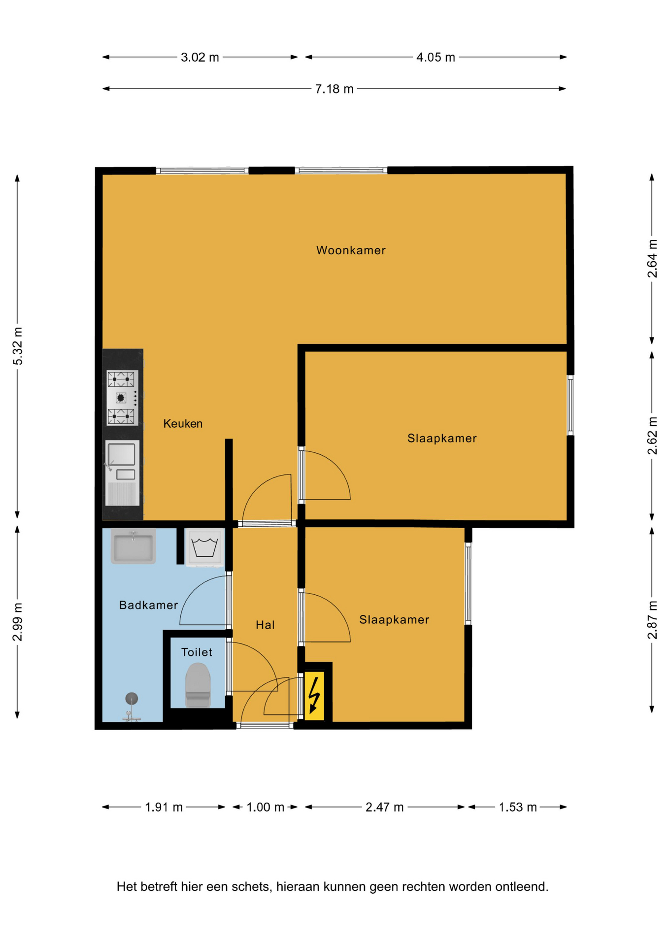 Indeling: entree/hal, toilet, badkamer met douche en wastafel, woonkamer met aangrenzend de keuken voorzien van diverse inbouwapparatuur (koelkast, kookplaat, afzuigkap, magnetron) en twee slaapkamers.