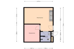 Indeling: entree, woonkamer met open keuken voorzien van koelkast, magnetron, kookplaat en afzuigkap, slaapkamer en badkamer met douche, toilet en wastafel.